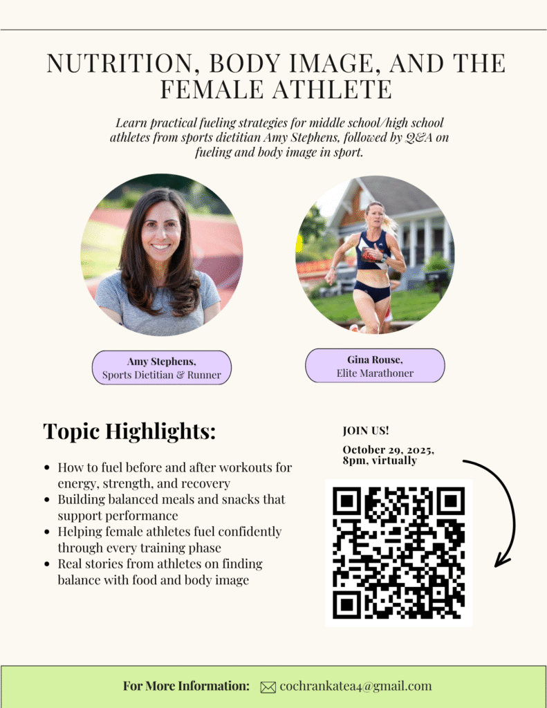 Join sports dietitian Amy Stephens and elite marathoner Gina Rouse as we discuss fueling female athletes. Topics will include: how to fuel before, and after workouts for energy, strength and recovery, building balanced meals and snacks that support performance, and helping female athletes fuel confidently through every training phase.