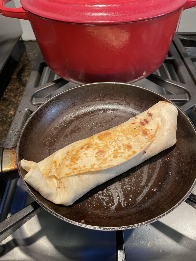 Tortilla + eggs + potatoes or rice + beans + cheese + salsa (+ avocado)