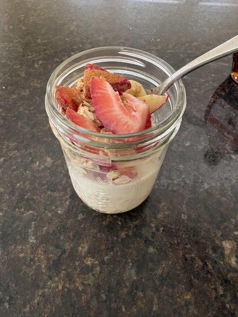 Oats provide steady carbohydrates, fruit adds quick energy, and nut butter supplies healthy fats and protein.