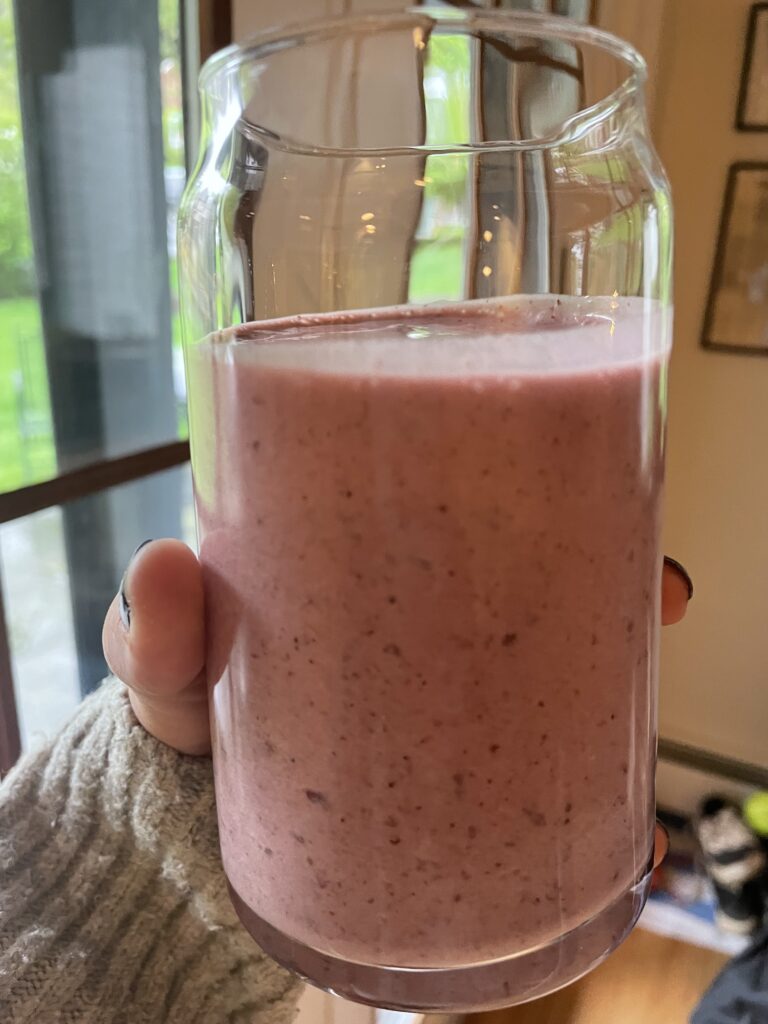 Milk (or fortified alternative) + banana + berries + oats + nut butter or yogurt + honey or maple syrup