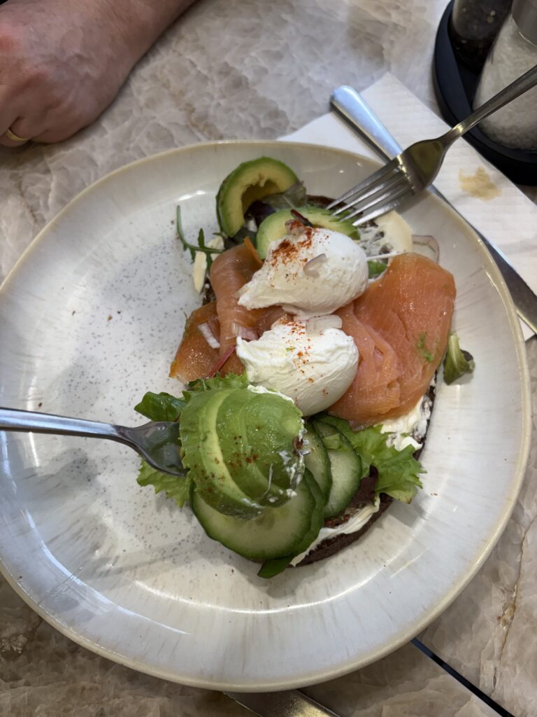 Sourdough toast topped with mashed avocado and smoked salmon.